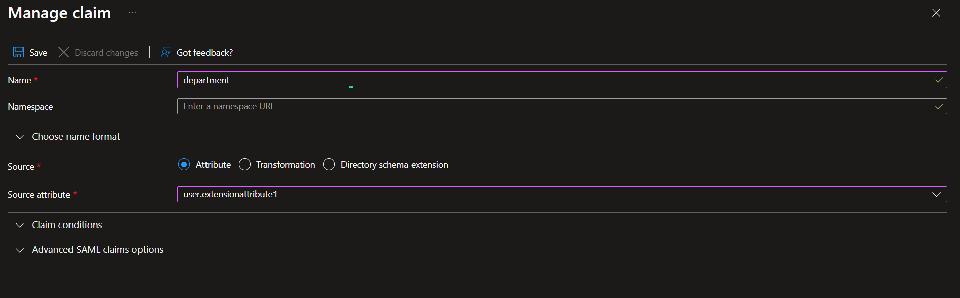 In the next screen you can give the desired name of the claim and then choose the source mapping. In the Source Attribute dropdown list, you can see all the extensionAttibutes from 1-15.