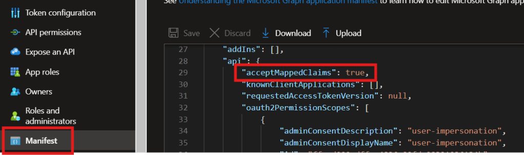 If you are using single tenant app, then next step is to update the acceptMappedClaims property to true in the application manifest file.